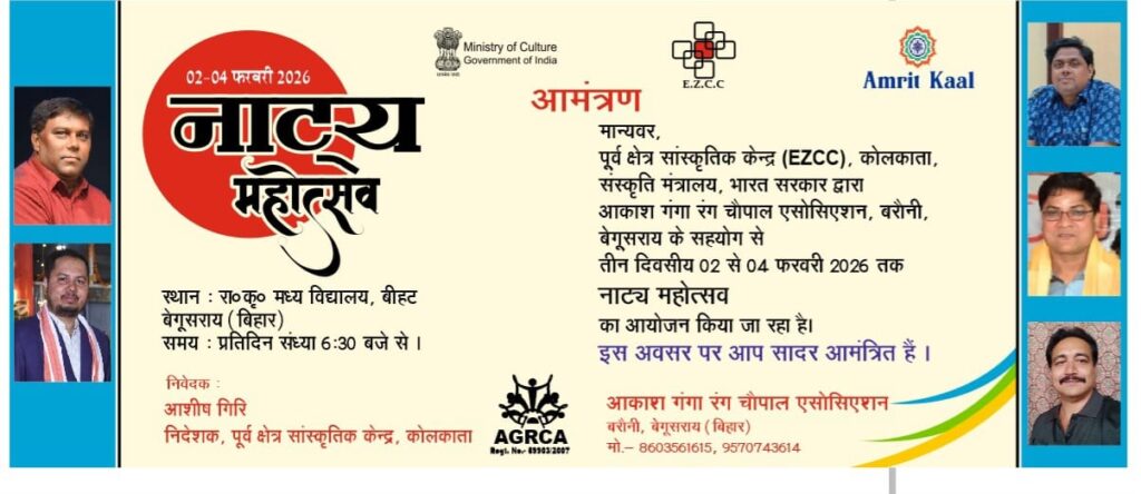 समाचार विचार/बीहट/बेगूसराय: पूर्व क्षेत्र सांस्कृतिक केंद्र, कोलकाता के द्वारा आयोजित व आकाश गंगा रंग चौपाल एसोसिएशन बरौनी द्वारा तीन दिवसीय नाट्य महोत्सव का आयोजन 2 फरवरी से किया जाएगा। इस बात की जानकारी देते हुए आकाश गंगा रंग चौपाल एसोसिएशन के अध्यक्ष डॉ. कुंदन कुमार ने बताया है कि पहली बार बीहट में भारत सरकार, संस्कृति मंत्रालय के पूर्व क्षेत्र सांस्कृतिक केंद्र कोलकाता द्वारा तीन दिवसीय नाट्य महोत्सव का आयोजन 2 फरवरी से 4 फरवरी तक किया जा रहा है। उन्होंने बताया कि मध्य विद्यालय बीहट के परिसर में आयोजित इस महोत्सव में रंगकर्म से जुड़े दर्जनों बेहतरीन कलाकार अपनी उपस्थिति से महोत्सव को यादगार बनाएंगे।