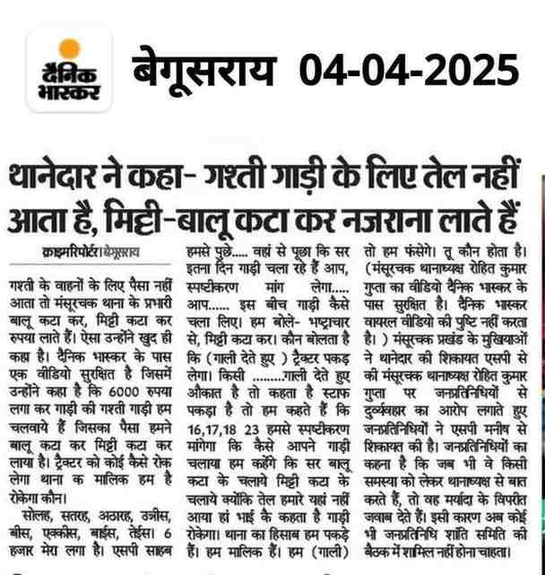 मंसूरचक मुखिया संघ के अध्यक्ष इजहार अंसारी ने बेगूसराय पुलिस के कप्तान को भी लिखित आवेदन दिया है, जिसमें गोविन्दपुर दो पंचायत के मुखिया राममूर्ति चौधरी ने भी थानाध्यक्ष रोहित कुमार गुप्ता पर सरकारी काम में बाधा उत्पन्न करने का आरोप लगाया है। उन्होंने बताया कि पंचायत के अंदर कई सरकारी योजनाएं चलाई जा रही है जिसमें मिट्टी भराई कार्य चल रहा है। उन्होंने बताया कि थाना प्रभारी क्षेत्र में भ्रष्टाचार का नंगा नृत्य कर रहे हैं। उन्होंने खुलेआम प्रति ट्रैक्टर बोली लगा रखी है। अगर कोई व्यक्ति थाने को जानकारी देकर मिट्टी कटाई करता है तो उसे तीन हजार रुपए देने पड़ते हैं और अगर कोई जानकारी नहीं देने पर मिट्टी कटाई करता है तो पकड़े जाने पर उसे दस हजार रूपया देने पड़ते हैं। रकम नहीं देने पर काम बंद करवा दिया जाता है, जिससे जनहित से जुड़े कार्य में अवरोध उत्पन्न हो रहा है।