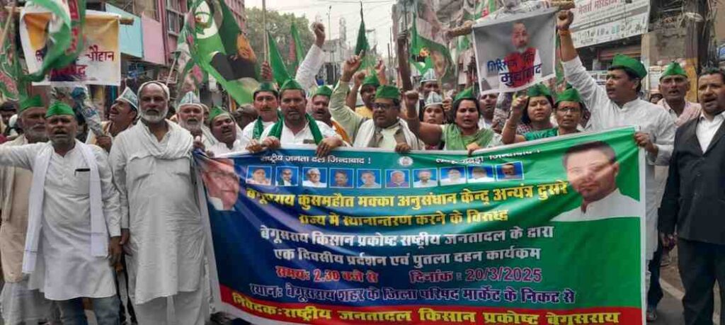 देश के कृषि मंत्री शिवराज सिंह चौहान, केंद्रीय मंत्री गिरिराज सिंह के सहयोग से और देश के प्रधानमंत्री नरेंद्र मोदी के इशारे पर मक्का अनुसंधान केंद्र को स्थानांतरित कर कर्नाटक राज्य के शिवमोगा में स्थापित करने के विरुद्ध बेगूसराय किसान प्रकोष्ठ राष्ट्रीय जनता दल जिला अध्यक्ष त्रिभुवन कुमार सिंह पिंटू की अध्यक्षता में पुरजोर तरीके से विरोध प्रदर्शन एवं देश के कृषि मंत्री शिवराज सिंह चौहान और केंद्रीय मंत्री गिरिराज सिंह का पुतला दहन किया गया। इस कार्यक्रम जिले भर के पार्टी नेता एवं कार्यकर्ताओं ने भाग लिया। उपस्थित पार्टी के नेता एवं कार्यकर्ताओं ने बेगूसराय शहर के जिला परिषद मार्केट से जुलूस के शक्ल में विरोध प्रदर्शन करते हुए सरकार विरोधी नारा लगाते हुए अंबेडकर चौक, कचहरी चौक, थाना चौक, हड़ताली चौक, नगर पालिका चौक, नवाब चौक पर प्रदर्शन कर सरकार विरोधी नारा लगा रहे थे। मक्का अनुसंधान केंद्र को वापस लाना होगा, शिवराज सिंह चौहान, नरेंद्र मोदी हाय हाय, गिरिराज सिंह मुर्दाबाद का नारा लगाते हुए समाहरणालय के उत्तरी द्वारा कैंटीन चौक पर पहुंचते ही जुलूस सभा में तब्दील हो गया। कैंटीन चौक पर कृषि मंत्री शिवराज सिंह चौहान एवं केंद्रीय मंत्री गिरिराज सिंह का पुतला दहन किया गया। कार्यक्रम को संबोधित करते हुए जिला अध्यक्ष मोहित यादव ने कहा कि केंद्रीय मंत्री गिरिराज सिंह के इशारे पर केंद्रीय कृषि मंत्री शिवराज सिंह चौहान के माध्यम से देश के प्रधानमंत्री नरेंद्र मोदी के इशारे पर संयुक्त मोर्चा सरकार के द्वारा बेगूसराय में स्थापित मक्का अनुसंधान केंद्र को कर्नाटक राज्य के शिवमोगा स्थानांतरित किया गया है। यह बेगूसराय सहित पूरे बिहार का अपमान है। राष्ट्रीय जनता दल मक्का अनुसंधान केंद्र को बचाने के लिए सड़क से लेकर सदन तक आंदोलन जारी रखेगा मौके पर जिला उपाध्यक्ष मदन रजक, जिला उपाध्यक्ष सुधीर कुमार सिंह, जिला उपाध्यक्ष मनोज यादव, राज्य परिषद सदस्य देवेंद्र प्रसाद यादव, झुग्गी झोपड़ी प्रकोष्ठ जिला अध्यक्ष सुमन पासवान, महिला राजद जिला अध्यक्ष प्रेमलता यादव, महानगर महिला राजद जिला अध्यक्ष रीना जायसवाल, व्यवसायिक प्रकोष्ठ जिला अध्यक्ष बूटन साह, मजदूर प्रकोष्ठ जिला अध्यक्ष रामानंद प्रसाद, अनुसूचित जाति अनुसूचित जनजाति प्रकोष्ठ जिला अध्यक्ष शिवनारायण राम, छत्र राज जिला अध्यक्ष रवि कुमार यादव ,महिला राजद प्रदेश महासचिव सावित्री कुशवाहा, मोहम्मद इकबाल पंचायती राज प्रकोष्ठ प्रदेश महासचिव निशांत कुमार सिंह श्रमिक प्रकोष्ठ प्रधान महासचिव अजय पटेल, वही कार्यक्रम में उपस्थित प्रखंड अध्यक्ष कैलाश यादव, प्रखंड अध्यक्ष शिव शंकर सिंह चंद्रवंशी, प्रखंड अध्यक्ष सहजानं