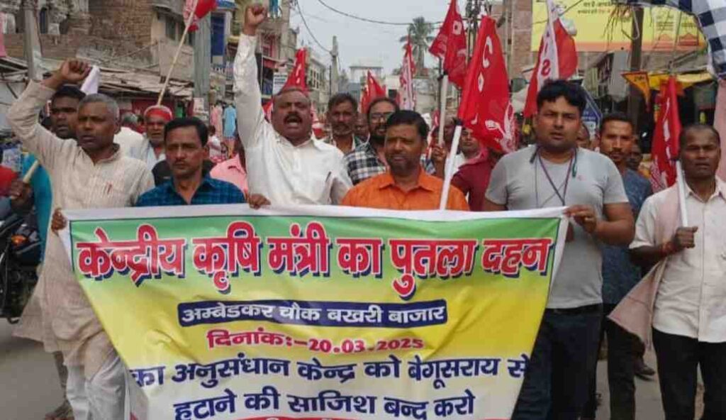 गुरुवार को मक्का अनुसंधान केन्द्र बेगूसराय से हटाये जाने के पत्र पर भड़कते हुए बखरी में सीपीआई द्वारा भाजपा सरकार के कृषि मंत्री शिवराज सिंह चौहान का पुतला दहन किया एवं वारयल पत्र की प्रति को जला कर अपना विरोध प्रदर्शन किया। उक्त मौके पर सीपीआई के जिला परिषद सदस्य जितेन्द्र जीतू ने कहा कि मक्का अनुसंधान केन्द्र को बेगूसराय से हटाने का निर्णय केंद्र सरकार का आत्मघाती कदम होगा। चूंकि बेगूसराय, खगड़िया, सहरसा, मधेपुरा, पूर्णिया सहित बिहार के कई जिले मक्का उत्पादन में अव्वल रहता है। इसे देखते हुए ही तत्कालीन यूपीए सरकार के कृषि मंत्री चतुरानंद मिश्र ने बेगूसराय के कुसमहोत में मक्का अनुसंधान केन्द्र की स्थापना किया था। बावजूद वर्तमान एनडीए सरकार के कृषि मंत्री शिवराज सिंह चौहान ने उक्त मक्का अनुसंधान केन्द्र को बेगूसराय से हटाकर कर्नाटक स्थानांतरण हेतु पत्र निकाल दिया है। यह बेगूसराय का दुर्भाग्य है कि यहां के सांसद का इस मामले पर आवाज नही निकल रहा है। इनका आवाज सिर्फ हिंदू-मुसलमान में झगड़ा फंसाने के लिए ही निकलता है। कार्यक्रम में सुरेश सहनी, मो. शबाब आलम, पार्टी नेता बलराम स्वर्णकार, यूथ फेडरेशन अंचल अध्यक्ष संजय राय, मो. आजाद खान, सचिव सुमित चौधरी, राकेश मालाकार, रौशन राम, ए आई एस एफ नेता ऋषि कुमार, आरजू खान, नरेश पासवान, मो. जैनुल, रामउदय महतों, भुवनेश्वर सदा, मो. गफ्फार,मुद्दी, विनोद सदा आदि ने भाग लिया। बाजार स्थित सूर्यनारण सिंह स्मारक भवन बखरी से सीपीआई के सैकड़ो कार्यकर्ता केंद्रीय कृषि मंत्री शिवराज सिंह चौहान का पुतला लिए भाजपा सरकार के विरुद्ध नारेबाजी करते हुए बाजार का भ्रमण करते हुए अम्बेडकर चौक पर पहुंचकर वायरल पत्र की प्रति एवं पुतला को जलाया।